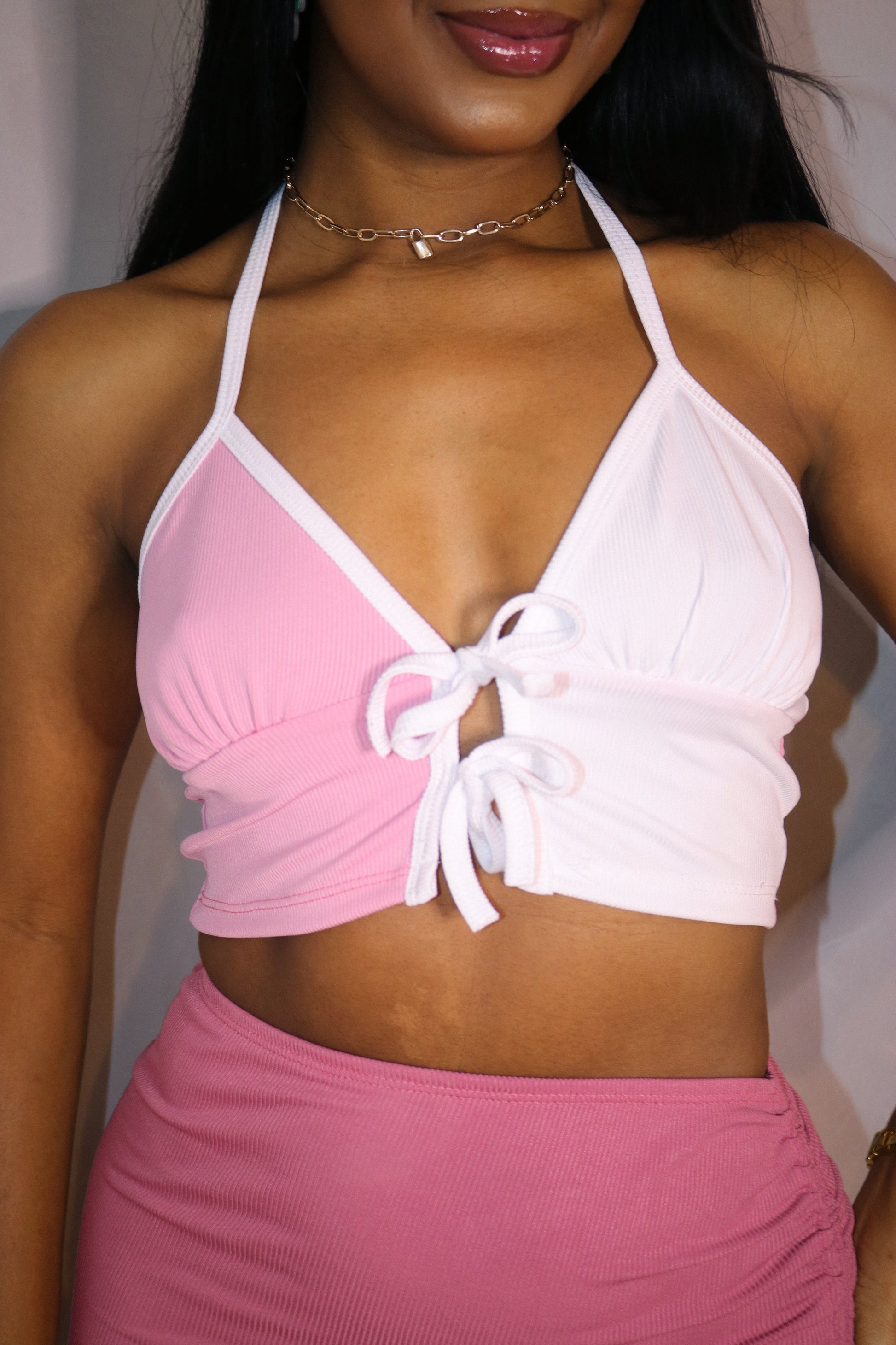 Features: stretchy, colour block style, adjustable ties, ribbed, cropped at waist.