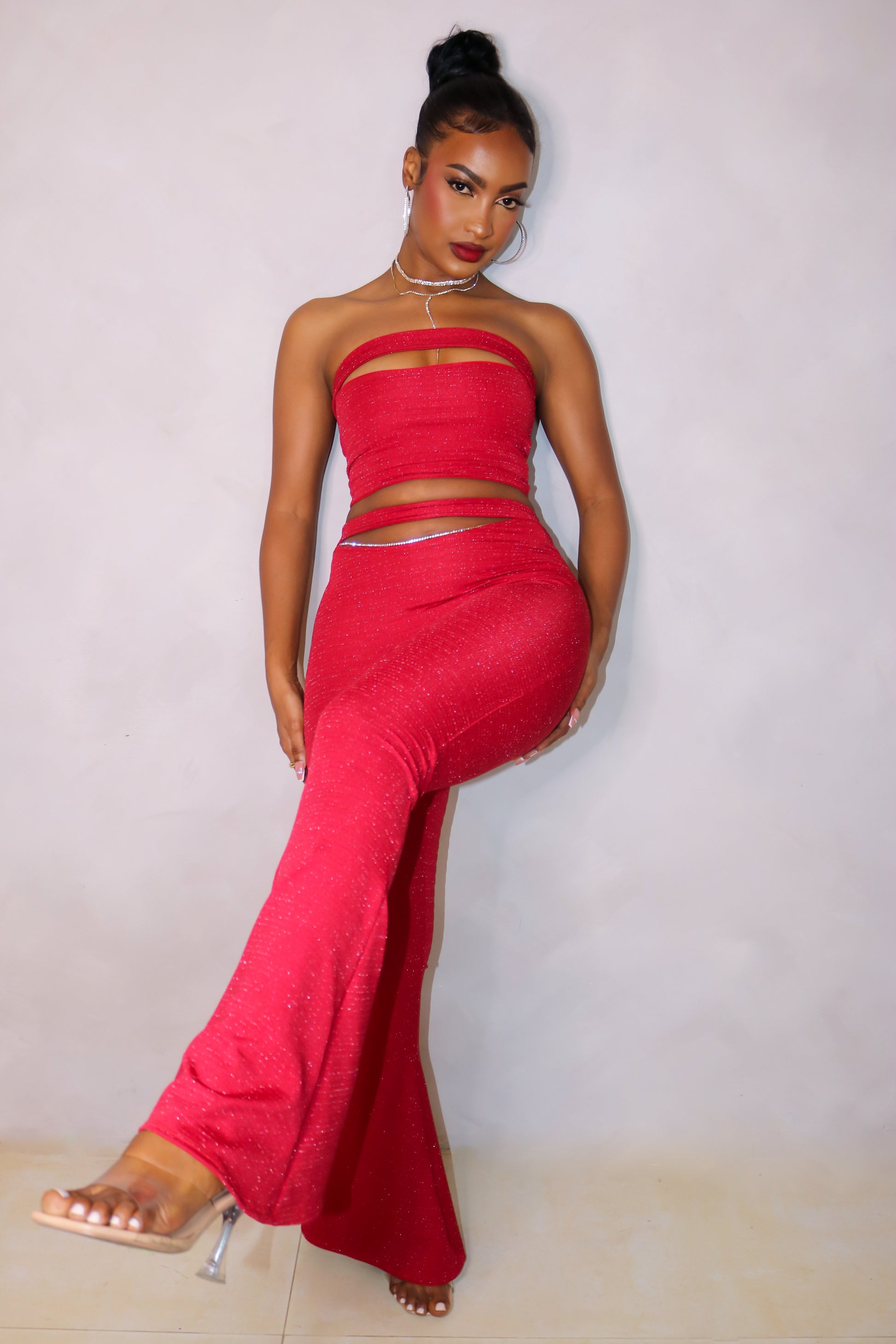 Features: limited stretch, double-lined top, low bell bottoms, cutout details, glittery fabric, floor length pants.